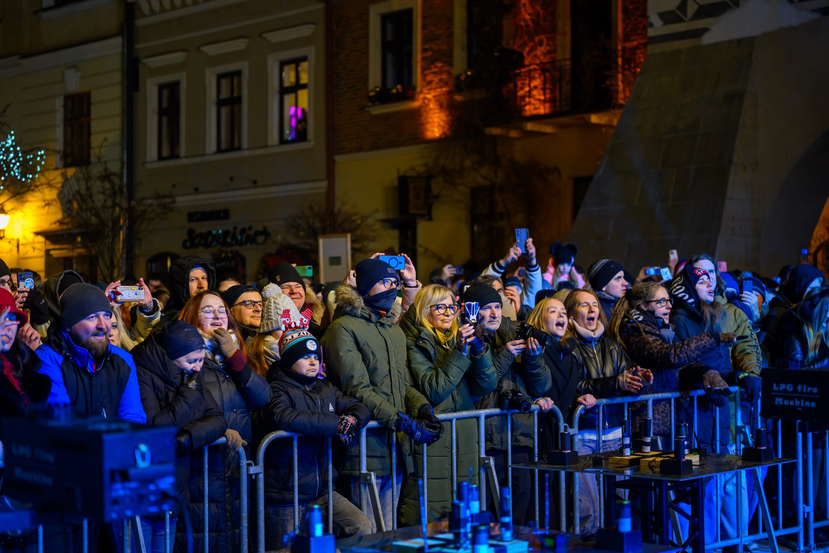• Sylwester na tarnowskim Rynku - Sylwestrowa publiczność podziwiająca pokaz ogni i fajerwerków