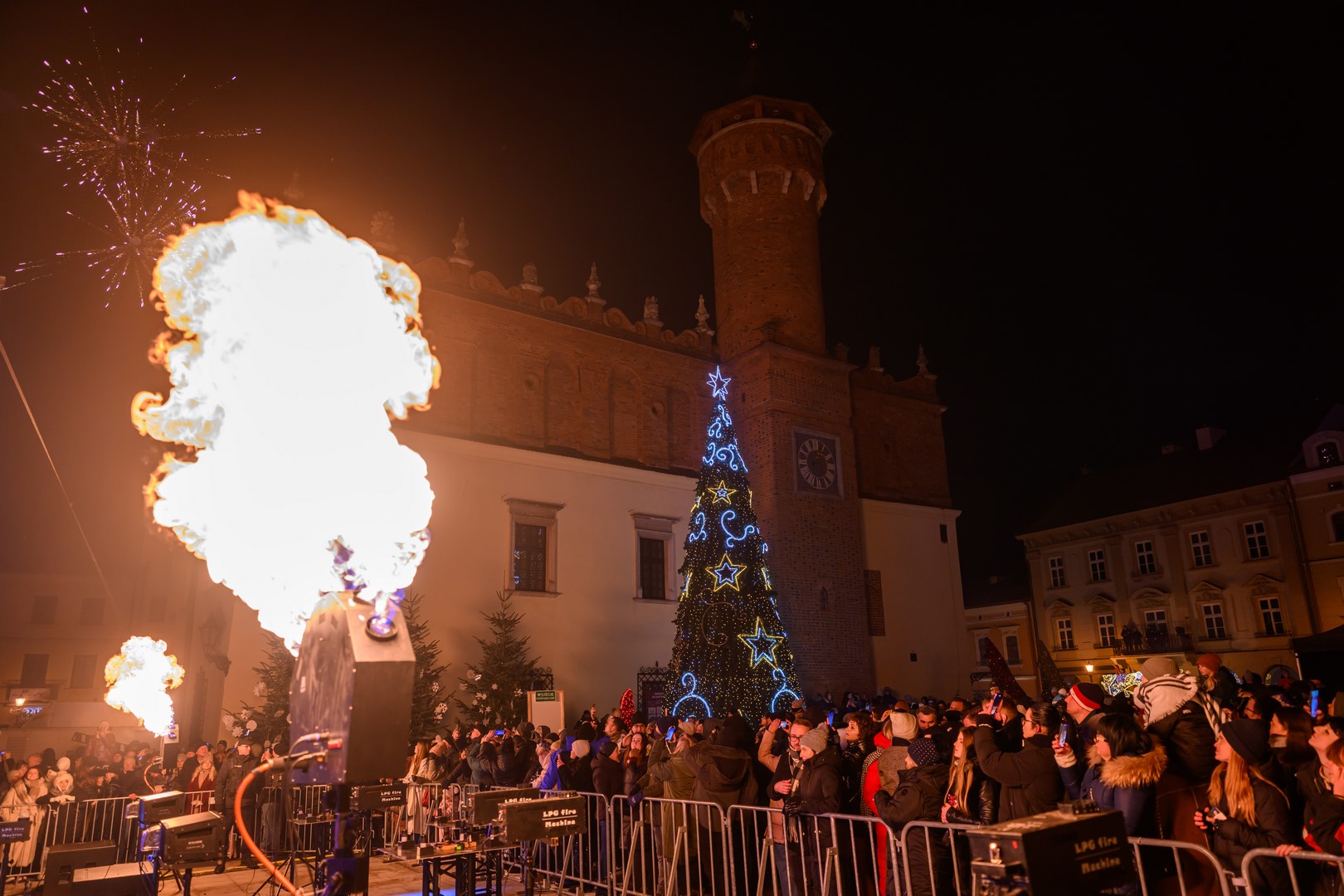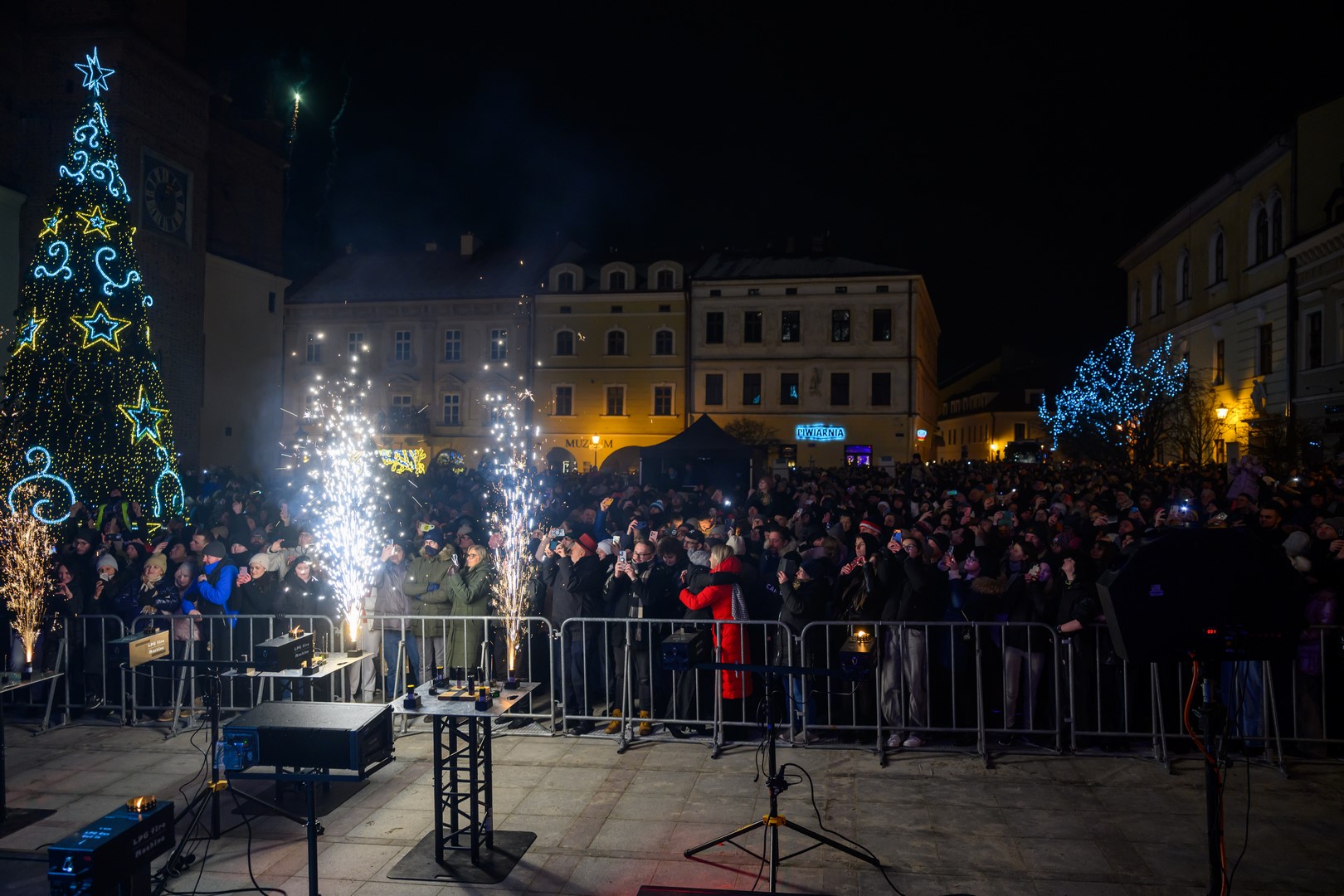 • Sylwester na tarnowskim Rynku - Publiczność zebrana przed sceną podziwia pokaz ogni