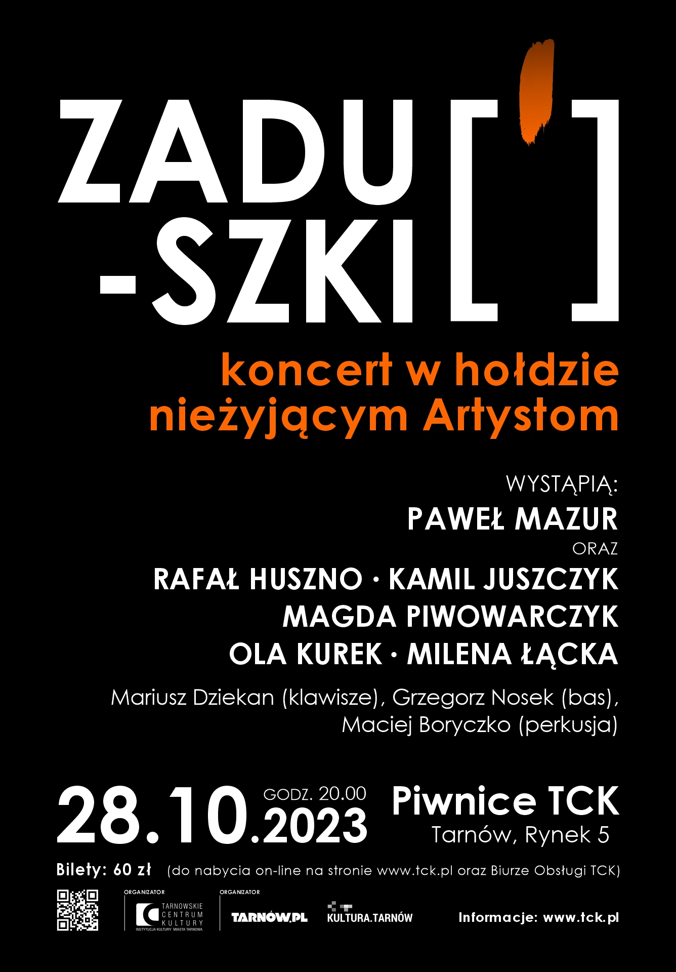 Zapraszamy na kolejny koncert zaduszkowy do Piwnic TCK - kultowego miejsca dla "tarnowskiej sceny muzycznej". Występowali tu najwięksi polscy rockmani, jazzmani, a nawet kabarety i standuperzy. Koncert zaduszkowy upamiętni nieżyjących artystów, którzy na zawsze pozostawili swoje ślady w historii muzyki. Znowu zagramy nieśmiertelne utwory i po raz kolejny będzie to wieczór pełen ciepła, wspomnień i wzruszeń. Koncert wpisuje się w wieloletnią tradycję "Zaduszek" organizowanych przez Tarnowskie Centrum Kultury od 1994 r.