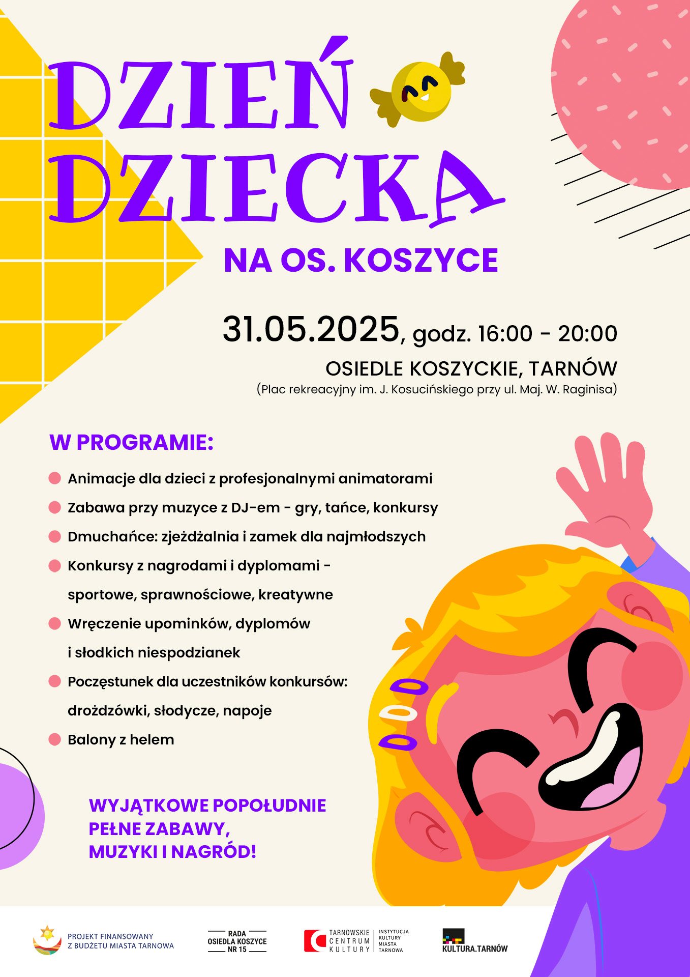 Już wkrótce Plac Zabaw, Rekreacji i Sportu im. Janusza Kusocińskiego przy ul. mjr. Władysława Raginisa na osiedlu Koszyce w Tarnowie zamieni się w tętniące życiem centrum dziecięcej zabawy. Organizatorzy przygotowali wiele atrakcji, które zapewnią najmłodszym niezapomniane popołudnie pełne śmiechu, ruchu i pozytywnej energii.