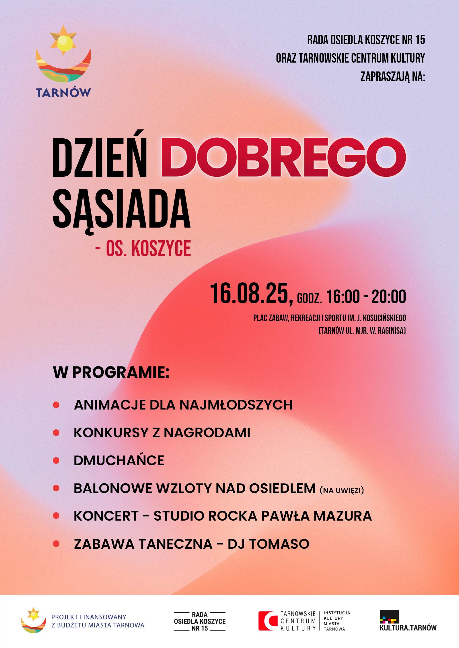 Wspólna zabawa, rozmowa i uśmiech – właśnie w taki sposób chcemy świętować Dzień Dobrego Sąsiada na osiedlu Koszyce. To doskonała okazja, by spotkać się nie tylko z sąsiadami zza płotu, ale także z mieszkańcami innych części Tarnowa, porozmawiać, spędzić czas razem i poczuć prawdziwie sąsiedzką atmosferę.
