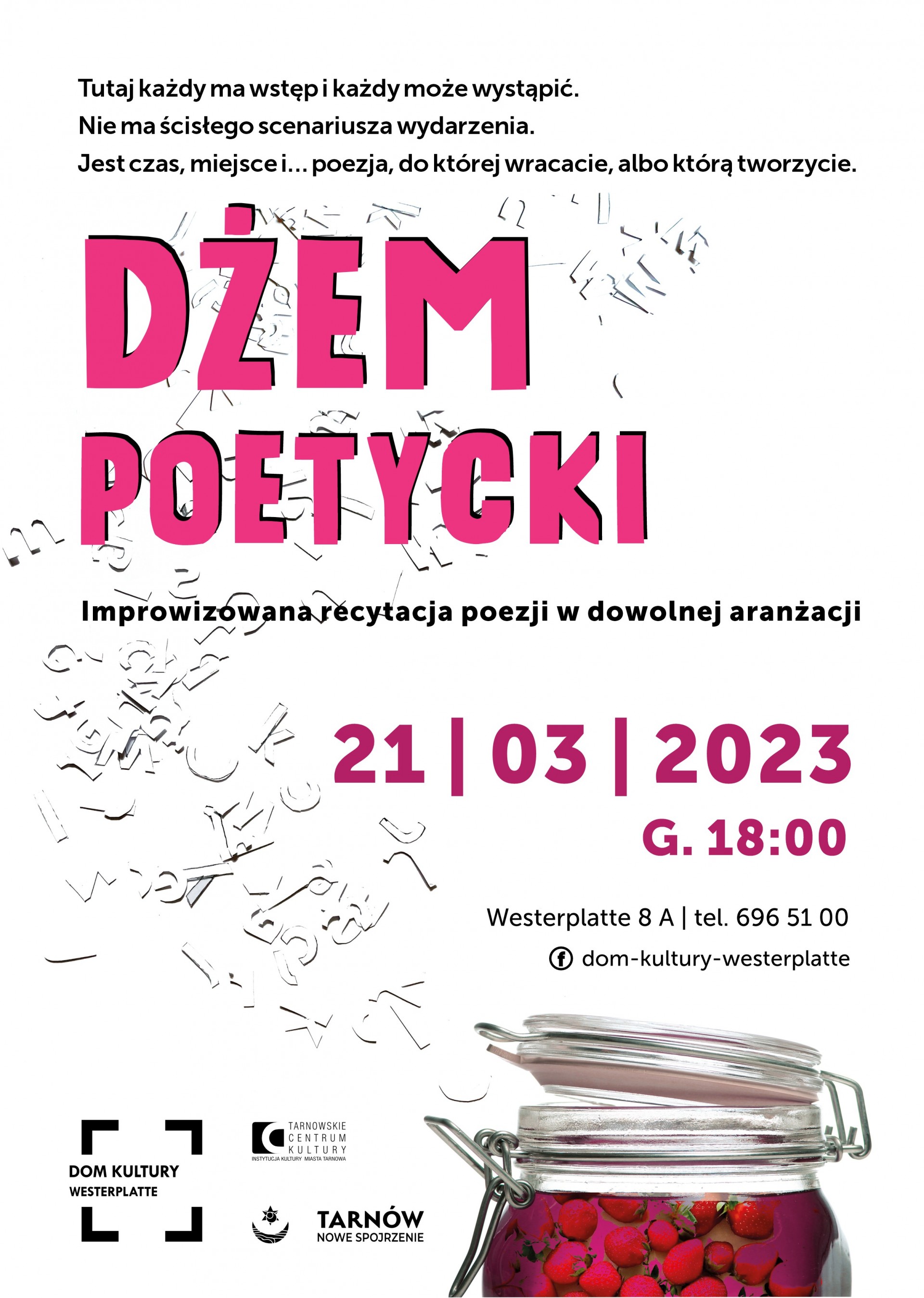 Osoby chętne by zaprezentować podczas Dżemu Poetyckiego swoją twórczość prosimy o kontakt: d.omylska@tck.pl